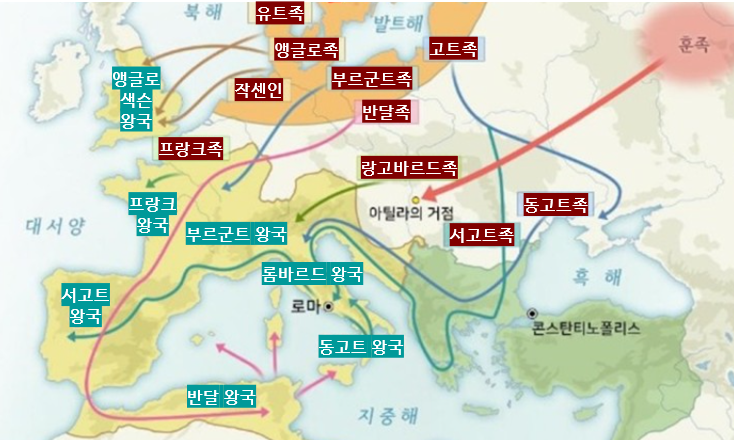 프랑크족 : 라인강 → 프랑스(북부 갈리아)