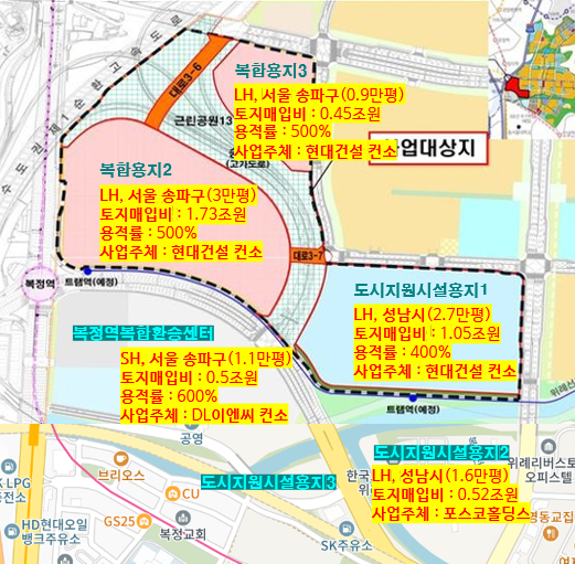 위례신도시 자족기능 확충을 통한 도시활성화와 주민의 편익 증진을 목적으로 LH에서 준비했던 부지이다. 대규모 개발사업에서 사업비 못지 않게 관심을 가져야 하는 것이 토지매입비(토지원가)인데, 이는 지역거점의 토지매입가격이 배후 대장아파트의 기대고점을 가늠하는 잣대가 될 수 있기 때문이다. 사업비 10조원 가량의 복정역세권의 토지매입비는 약 3.2조원(평당 4,900만원대)이다. 2024년 현재 기준으로 평당 5천만원이 채 안되는 토지가격이 싸다고도 느껴지며, 이미 3개 블록 모두 대기업들이 선점한 상태이다. 복정스마트시티 내 서울권역 2개 블록은 서울시에 의해 용적률 500% 상업지역으로 종상향되었다. 3개 블록 총 연면적은 코엑스의 2배 이상이라고 생각하면 된다. 허허벌판에서 어마어마한 규모의 공간이 재탄생하는 것이다.
