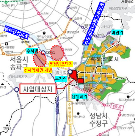 그 빈땅은 위례신도시 남서쪽에 위치한 3개 블록(필지) 개발사업 예정지로, 복정역과 연결되어 「복정역세권 스마트시티 사업대상지(복정역세권)」이라 불린다.