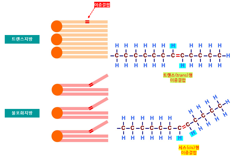 이전 글 <생각하기 나름인, 콜레스테롤>에서는 지방을 이루는 지방산에 대해 전반적으로 살펴봤었다. g당 열량이 9kcal인 지방은 탄수화물·단백질보다 훨씬 효율적인 에너지원인 만큼, 체중증가의 위험도 더 크다. 지방분자는 3가지 원소(탄소·산소·수소)가 연결된 구조로, 탄소를 중심으로 뻗은 가지 끝에 수소가 붙어 있는 모습이다. 가지에 수소가 꽉 찬 구조가 포화지방산이고, 가지에 수소가 다 채워지지 않은 채로 몇군데 비어 있는 구조가 불포화지방산이다. 불포화지방이 포화지방보다 건강에 유익하지만, 트랜스지방(불포화지방의 일종)은 포화지방보다 심혈관계에 2~4배 더 유해하다고 알려져 있다. 포화지방은 콜레스테롤과 합성하는 성질을 지니고 있어, 과다섭취는 LDL수치를 높인다. 그렇다고 포화지방이 무조건 나쁜 것은 아닌데, 피하지방층의 일부를 형성하기 때문이다.