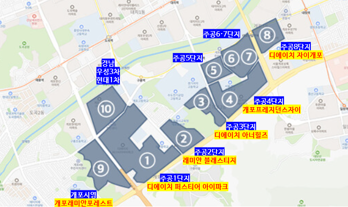 개포동(開浦洞)은 대모산 아래 갯벌이 있던 자리로, 음변화(갯펄-개패-개포)가 지역명으로 자리 잡았다고 한다. 제대로된 수리시설이 갖춰지지 않았던 과거의 개포는 거주·왕래가 거의 없던 공간이었다. 1970년대 대규모 서민주거단지 공급을 목표로 한 토지구획정리사업을 하였으나, 이내 발생한 오일쇼크로 사업은 제대로 진행되지 못했다. 그러다 1980년 택지개발촉진법이 제정되면서, 정부 주도의 공영개발이 시작되었다. 이러한 과정을 거치면서 개포동은 서민을 위한 주공아파트(5층 이하, 초소형)로 들어찼고, 다른 강남권과 달리 서민거주지역으로 자리잡게 되었다.