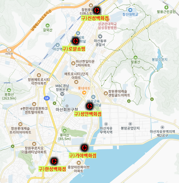 1980년대 초 마산시 인구는 40만명 수준으로 증가하였고, 도시구조도 구도심(창동 일대)에서 합성동 방면으로 확장되고 있었다. 이에 구도심-산호동-합성동 라인에 백화점들이 많이 위치하게 되는데, 대표적인 백화점은 다음과 같았다.