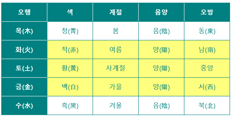 오행은 오랫동안 다양하게 활용되어 왔는데, 풍수지리·한의학·굿·한글이 대표적이다. 무당이 굿을 하듯이, 한의사를 한무당으로 비하하는 표현도 추상적인 오행에 근거하기 때문일 수 있다. 훈민정음 해례본에서 설명하는 한글의 음성원리에 따르면, 자음·모음은 각각 오행·음양에서 비롯되었다고 한다. 이전 글 <조선여성의 핫플레이스, 숙정문>에서는 조선시대 굳게 닫혔던 북문들이 음양오행설에 따라 개방되기도 했었다고 언급하면서, 오방에 따른 오행·음양을 표로 나타냈었다. 이를 순서를 바꿔서 표현하면 다음과 같다.