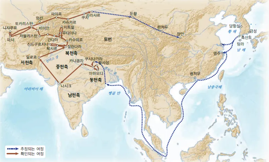 천축(天竺)은 중국인들이 부르던 인도의 옛 이름으로, 인더스강을 의미하는 미얀마어 「턴뚜」에서 유래했다고 한다. 신라 혜초(慧超)가 저술한 여행기 왕오천축국전(往五天竺國傳)에서의 여행경로는 중국 남해안을 시작으로 캄보디아·미얀마·말레이시아를 뱃길로 거쳐 뱅골만(인도 동부)에 이르렀는데, 3달 가량 걸렸다고 한다. 천축의 5개 지역의 순례를 마친 혜초는 인도 서부를 시작으로 북부의 실크로드로 중국에 귀환했다. 당시 대부분의 사람들은 태어난 지역에서 생을 마무리했다는 점을 감안하면, 혜초는 신라에서 가장 넓은 지역을 여행한 사람이 아닐까 한다.