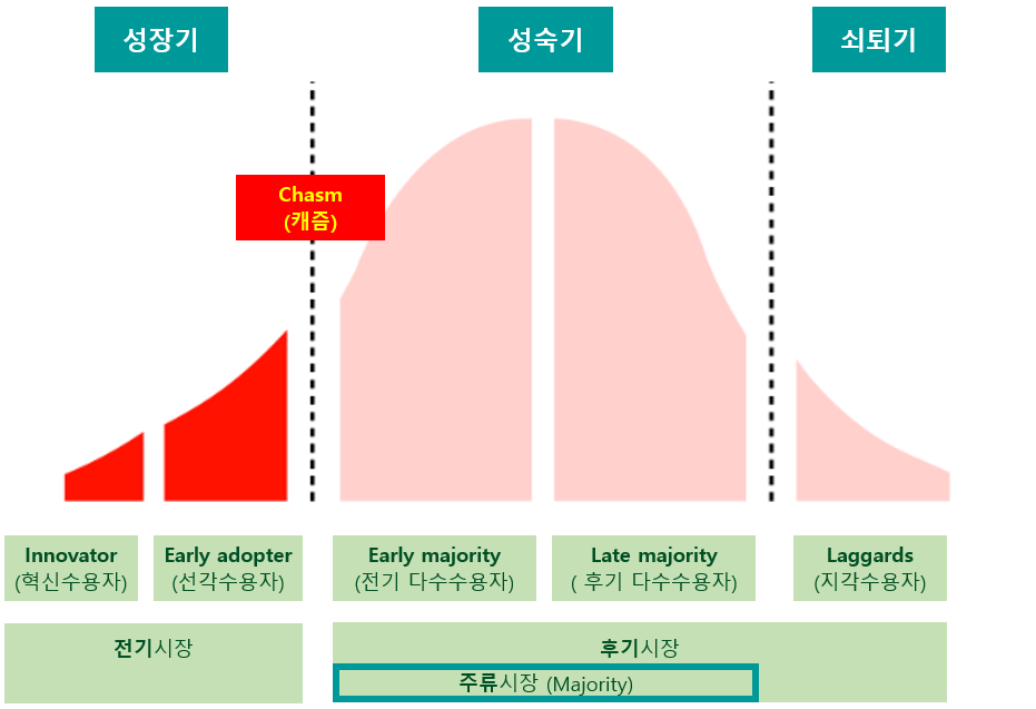 캐즘의 주된 원인은 초기시장과 주류시장의 괴리이다. 초기시장은 제품의 혁신성을 중시하는 반면, 주류시장은 실용성을 중시한다. 이에 따라 얼리어답터(선각수용자)와 다수수용자 간의 수용성에 대한 심리적 차이가 시차(time lag)로 나타나며, 기업이 접근해야 할 마케팅 전략도 달라진다.