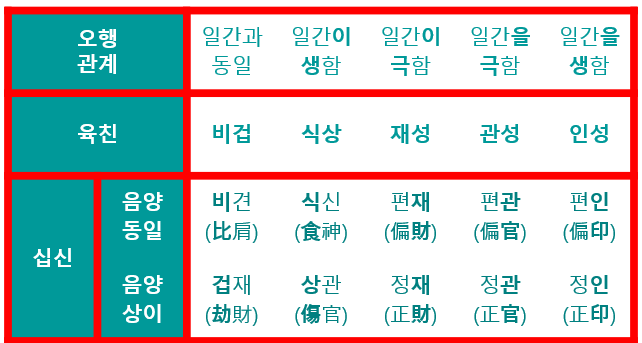 명리학은 오행의 관계을 인생(인간관계·상생상극)에 대입하는 실전학문으로, 그 도구로 육친이 활용된다. 육친은 2가지(일간·오행)의 관계를 통해 다음의 5가지(비겁·식상·재성·관성·인성)로 표현된다.