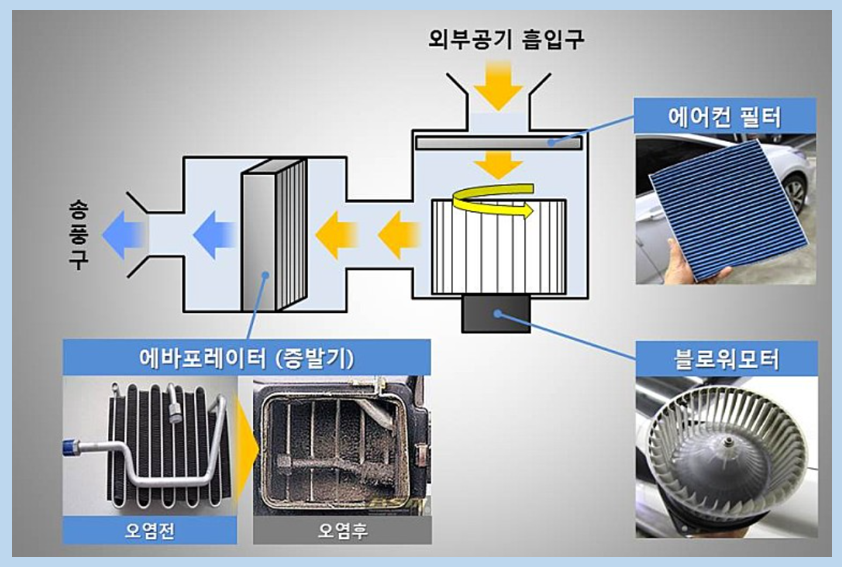 자동차 에어컨을 켜면, 블로워모터가 실내외 공기를 에어컨필터를 거쳐 흡입한 후에 에바포레이터를 거치면서 시원한 바람이 나오게 된다. 기화가 일어나는 에바포레스터에서는 온도차에 따른 물기가 생기게 마련인데, 이러한 습한 환경 하에서는 촘촘한 알루미늄관은 곰팡이나 세균에게 최적의 서식처를 제공한다. 에바포레이터에 수월하게 접근하기 위해서는 블로워모터를 탈거해야 하고, 그에 앞서 글로브박스의 하단을 미리 탈거해야 한다. 대부분의 국산차는 블로워모터·블로워팬의 분리가 가능한 분리형이라서, 블로워팬의 물세척이 가능하다. 하지만 일체형이 많은 외제차는 블로워팬의 물세척이 어려워, 에어건·브러쉬로 먼지를 꼼꼼히 제거할 필요가 있다.