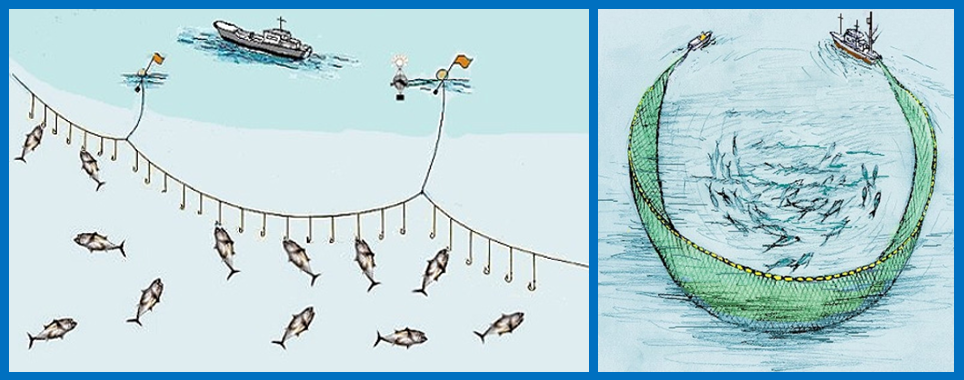 한국의 참치 어획량에서 선망이 차지하는 비중이 연승에 비해 6배 가량 많다. 연승(連繩, Longline)은 하나의 모릿줄에 50~80m 간격으로 2,000~3,000개의 낚시를 늘어뜨려 미끼(고등어·청어·오징어 등)를 달아 참치를 잡는 방식이다. 생선에 상처를 덜 주는 연승은 횟감용(대형참치)을 포획에 주로 사용한다. 선망(旋網, Purse Seine)은 대형 그물(길이 2.5km, 높이 200m)로 참치무리를 둘러싼 후, 그물의 아랫부분을 조여서 잡는 방식이다. 한 번에 작은 참치를 100톤 이상 포획할 수 있으며, 주로 통조림이나 가쓰오부시 재료로 쓰인다.