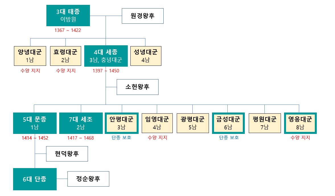 1452년(문종 2) 5월 문종이 38세의 젊은 나이로 승하한 후, 12세의 단종이 왕위에 올랐다. 왕이 직접 정사를 돌볼 수 없을 만큼 어릴 경우에는 왕실어른(보통 선왕비)가 수렴청정을 하지만, 단종의 할머니(소헌왕후, 세종비)·어머니(현덕왕후, 문종비) 모두 이미 사망한 상황이었다. 고립무원(孤立無援, 홀로 서서 도움이 없는)에 처한 조카왕을 지켜보며, 수양을 포함한 숙부들은 본격적으로 조정에 관여하며 정치에 나섰다. 만약 소헌왕후가 대왕대비로서 수렴청정을 하고 단종이 성년이 되어 친정을 펼칠 수 있도록 도왔다면, 수양이 어머니의 면전에서 조카를 내치고 스스로 왕이 되려고 했을까.